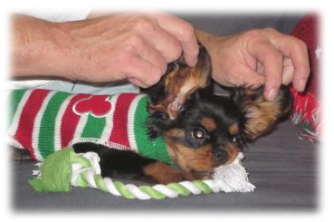 | Immanuel (Manny) on Christmas morning all warm and snuggly in his Christmas sweater! |