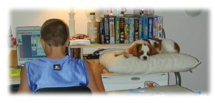 | CCC's Matriarch of the Ladies! Sabryna has been with me since the early days. Now spayed, she teaches all the generations behind her to be "team-players" -- except of course when it comes to the Oinkies pork rolls. They belong to HER! Sabryna is always just a butt-wiggle away. And....she's a GREAT GRANDMA! UPDATE ~ In November 2014, my precious Sabryna passed over Rainbow Bridge. She was 11.2 years old. Sabryna helped me raise my son; she had homework patrol with Danny (see below). She is now raising all the little boys in heaven that need her. RIP in my sweet "Sooshi!" We had so many funny names for her - Sooshi, Subee, Sue, Sooz. She was an amazing family dog! |